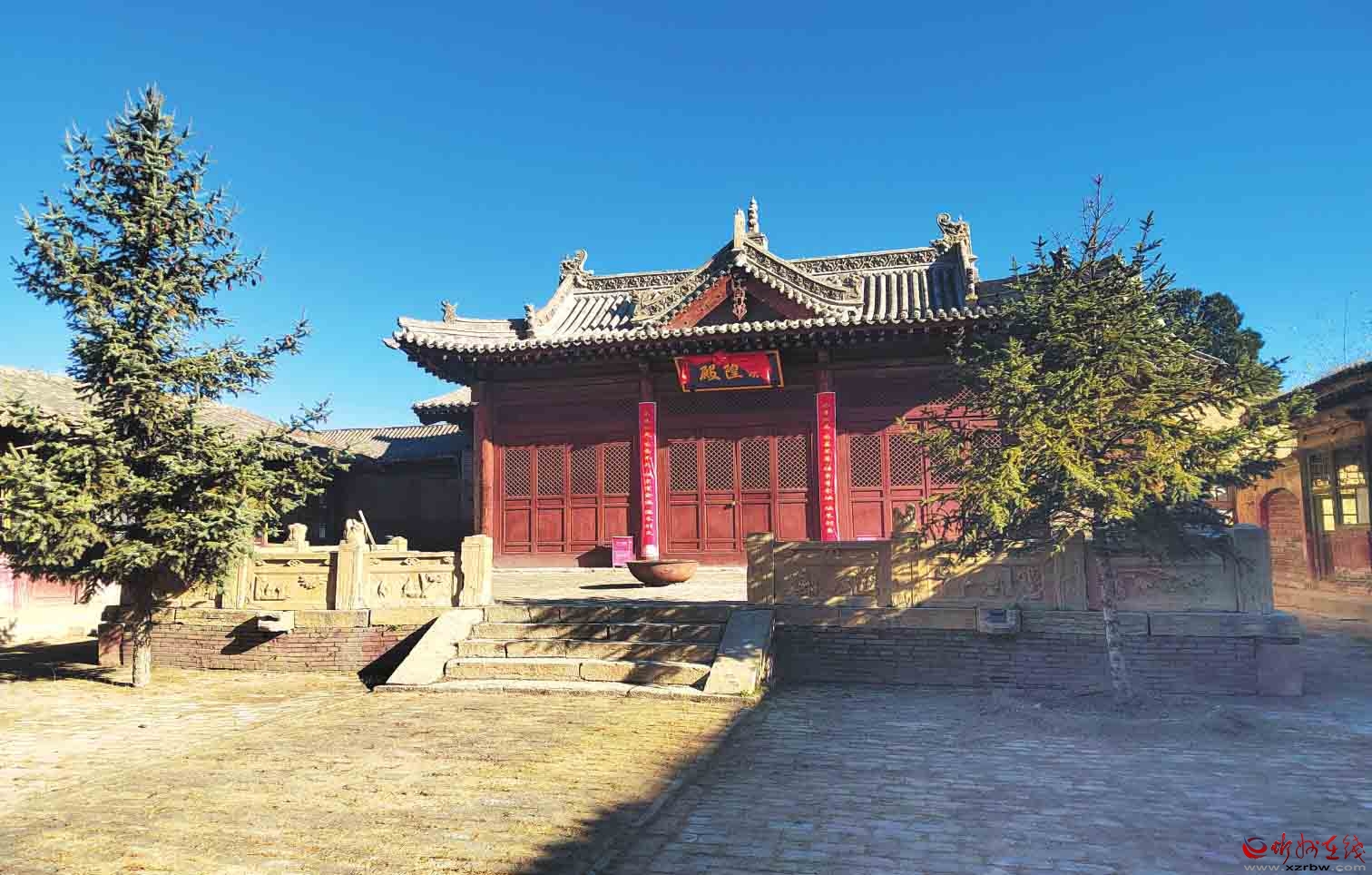 一進院布局,中軸線現(xiàn)存有正殿1棟,兩側建有配殿,西北角建有偏殿。正殿磚砌臺基,面寬五間,進深六椽,七檁前后廊式構架,前檐斗拱為五踩,后檐為三踩斗拱,單檐懸山頂。前設月臺,建有抱廈三間,單檐歇山頂?,F(xiàn)新塑像3尊,正殿梁架有彩繪。