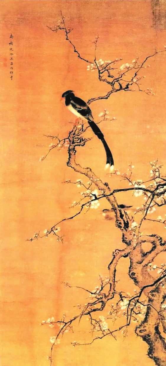 宋代畫家筆下的梅花大都與禽鳥有所關(guān)聯(lián),這主要得益于花鳥畫在此時的繁盛之勢。宋徽宗趙佶的《臘梅山禽圖》就把梅花與白頭翁聯(lián)系起來,描繪了在乍暖還寒的季節(jié)里,兩只相伴而生的白頭翁立于臘梅枝頭的場景,給觀者帶來復蘇之感。作品左下角題詩“山禽矜逸態(tài),梅粉弄輕柔。已有丹青約,千秋指白頭”,表達了愛情之思。因為白頭翁在傳統(tǒng)文化中象征吉祥與幸福,是對白頭偕老的隱喻,當它與梅花結(jié)合起來時,便會強化人們對美好愛情的聯(lián)想。