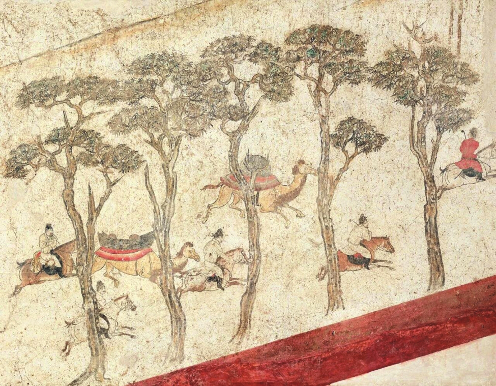 初唐淮安王李壽墓墓道東壁的《備馬出行圖》中,42匹青、灰、白、紅、褐各色交織的駿馬昂首闊步,馬上騎士手持紅旗,相互顧盼,一派王公貴胄儀仗出行的煊赫氣象;盛唐章懷太子李賢墓道西壁的《馬球圖》,20余騎馳騁如風(fēng),青山古樹為幕,馬蹄翻飛間盡顯“神駿追風(fēng)”的活力……這些定格在墻壁上的身影,不僅是唐代繪畫藝術(shù)的瑰寶,更是一扇窺見唐人生活脈搏的窗口。