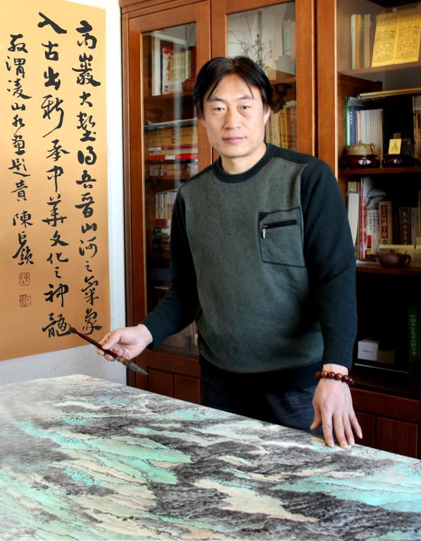 認識殷渭凌,是先認識他的畫,前幾年在一次省里畫展上看到了一幅山水畫,淳樸、厚重,樸實的親切、厚重的實在,完全沒有近幾年流行的風氣,也沒有長期臨摹傳統繪畫形成的習氣。正如一個從鄉(xiāng)村走出來的小伙,健康、有朝氣、單純、樸實、憨厚、怯生生的站在那里,給我留下了很深的印象。因為忻州地區(qū)畫山水的人不多,很快就認識了渭凌。果然人如其畫,淳樸、厚道、話不多、為人真誠,是個畫畫肯下功夫的小伙子。后來省美協山水畫藝委會的活動都有他的身影,畫越畫越多,畫的也越來越好,但是畫面中那種親切、樸實、厚重、蒼茫的特點卻一點兒也沒有丟失。濃濃的泥土氣息生發(fā)于筆墨中,散發(fā)在畫面里,在展廳里感染著每一個觀眾。晉西北風情在他的營造下得到了充分的體現。