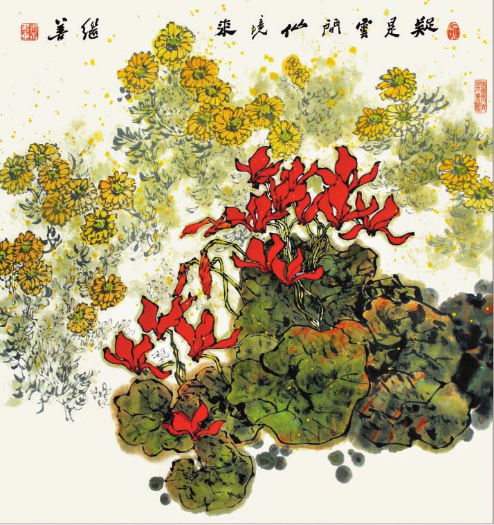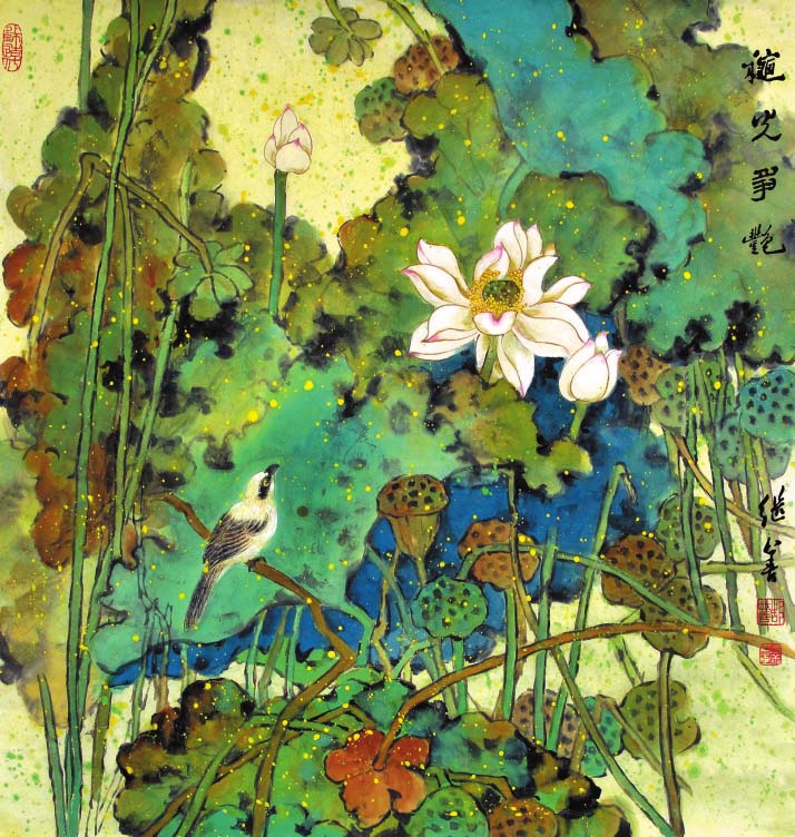 郜繼善的重彩花鳥(niǎo)畫(huà)偏傳統(tǒng),筆法細(xì)膩工整,色彩明麗典雅,構(gòu)圖大氣別致,情趣盎然,意境深遠(yuǎn)。作品中各種元素有機(jī)融合,自然穿插,形成和諧有序的布局,讓人既能感受到自然界的豐富與絢爛,又可體味藝術(shù)帶來(lái)的愉悅和感動(dòng)。在他的筆下,重彩成為了最具藝術(shù)感染力的手段,也是最有個(gè)性藝術(shù)特征的語(yǔ)言,鮮明、強(qiáng)烈,可謂“脫盡媚俗寫(xiě)重彩”。