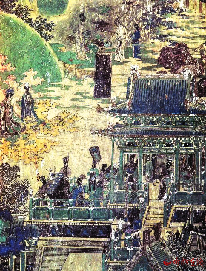 畫面中,有頭戴冠冕、身著長袍的王子,焚香祈禱的王后;有嬉戲玩耍的兒童,酒樓市井里的說唱賣藝者;還有撐傘的、捧鳥籠的凡夫俗子,儼然一幅幅生動(dòng)的古代宮廷生活圖、古代市井圖。豪華宮殿、樓閣、古塔、作坊、民居各類建筑應(yīng)有盡有,無不體現(xiàn)出畫師高超的技藝。