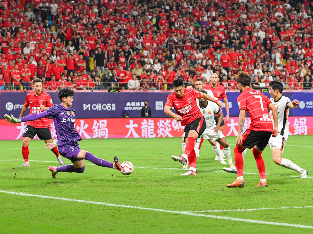 8月30日,成都蓉城隊(duì)球員楊帥(左三)在比賽中射門。當(dāng)日,在四川成都進(jìn)行的中國足球超級(jí)聯(lián)賽第23輪比賽中,成都蓉城隊(duì)主場(chǎng)4:1戰(zhàn)勝上海海港隊(duì)。新華社記者 王曦 攝