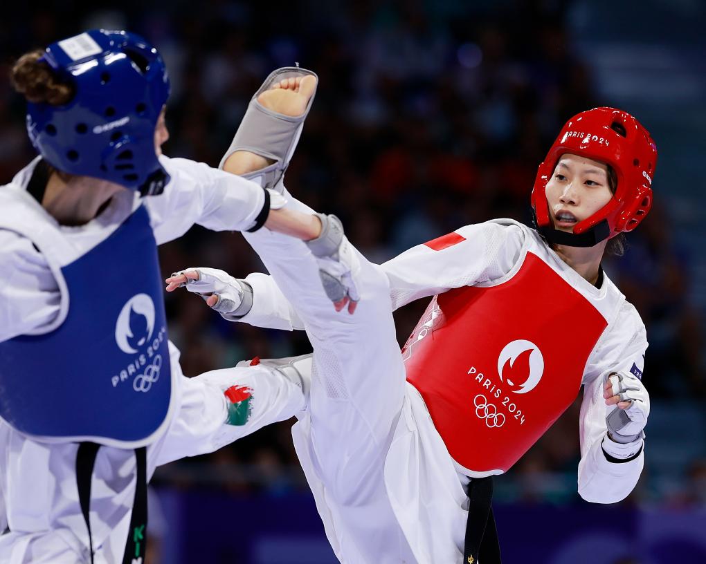 2024年8月8日,中國選手駱宗詩(右)在巴黎奧運(yùn)會(huì)跆拳道項(xiàng)目女子57公斤級銅牌賽上。新華社記者 費(fèi)茂華 攝