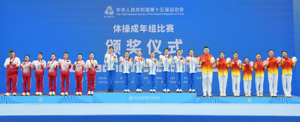 11月13日,冠軍浙江隊(中)、亞軍廣東隊(左)和季軍湖北隊及各隊教練在頒獎儀式上合影。新華社記者 胥冰潔 攝