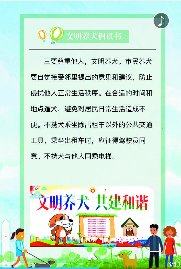 《文明養(yǎng)犬公告》包含十一項主要內(nèi)容,具體是:一、養(yǎng)犬人應(yīng)當(dāng)遵守有關(guān)法律、法規(guī),尊重社會公德,維護(hù)公共秩序,不得損害社會公共利益和他人的合法權(quán)益;二、養(yǎng)犬管理按照重點管理區(qū)和一般管理區(qū)實行分區(qū)管理。忻府轄區(qū)外環(huán)線范圍以內(nèi)為養(yǎng)犬重點管理區(qū)。其他區(qū)域為養(yǎng)犬一般管理區(qū);三、養(yǎng)犬實行狂犬病免疫制度。犬只出生滿三個月或者免疫期滿的,養(yǎng)犬人應(yīng)當(dāng)攜犬只到獸醫(yī)主管部門公布的犬只免疫網(wǎng)點接種狂犬疫苗;四、在重點管理區(qū)內(nèi)養(yǎng)犬實行責(zé)任書制度。村(居)民委員會或者社區(qū)物業(yè)管理機(jī)構(gòu)應(yīng)當(dāng)與養(yǎng)犬人簽訂養(yǎng)犬責(zé)任書,明確有關(guān)文明養(yǎng)犬的責(zé)任事項;五、在重點管理區(qū)內(nèi)養(yǎng)犬實行登記制度。養(yǎng)犬人應(yīng)當(dāng)自取得免疫證明之日起三十日內(nèi),到居住地公安派出所辦理養(yǎng)犬登記;六、在重點管理區(qū)內(nèi),禁止飼養(yǎng)、繁殖和經(jīng)營禁養(yǎng)名錄內(nèi)的烈性犬和大型犬(導(dǎo)盲犬除外);禁止開辦犬類養(yǎng)殖場;七、在重點管理區(qū)內(nèi)攜帶犬只出戶,應(yīng)當(dāng)遵守下列規(guī)定:(一)為犬只佩帶犬牌、束牽引帶,牽引帶長度不得超過兩米,在擁擠場合自覺收短牽引帶。(二)具有完全民事行為能力的人牽引。(三)主動避讓老年人、殘疾人、孕婦和兒童。(四)乘坐電梯,應(yīng)當(dāng)避開高峰期,征得電梯內(nèi)其他人的同意,佩戴嘴套或裝入犬籠、犬袋,并主動避讓他人。(五)及時清除犬只排泄的糞便。(六)不得攜犬進(jìn)入設(shè)有犬類禁入標(biāo)志的公園、廣場等公共場所。(七)不得攜犬乘坐大型公共交通工具,攜犬乘坐出租汽車時,須征得司機(jī)同意。(八)養(yǎng)犬不得干擾他人正常生活,不得放任、驅(qū)使犬只恐嚇、攻擊他人,影響他人休息的,養(yǎng)犬人應(yīng)當(dāng)采取措施予以制止;八、凡流浪犬或無人牽領(lǐng)的犬只,視為無主犬只予以收容;九、市民養(yǎng)犬應(yīng)當(dāng)按規(guī)定對所養(yǎng)犬只注射狂犬疫苗、定期檢疫。犬只出現(xiàn)狂犬癥狀的,養(yǎng)犬人應(yīng)當(dāng)及時采取捕滅措施,并向農(nóng)業(yè)部門報告,危害公共安全的,應(yīng)及時報告公安部門;十、違反有關(guān)規(guī)定將依據(jù)《忻州市養(yǎng)犬管理條例》、《中華人民共和國治安管理處罰法》等法律進(jìn)行處罰;十一、廣大市民應(yīng)積極抵制不文明養(yǎng)犬行為。對違反本通告規(guī)定的養(yǎng)犬行為,任何單位和個人都有權(quán)批評、勸阻,或者舉報。