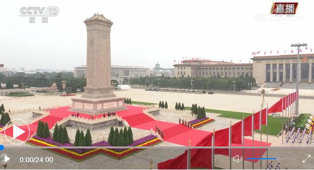 方陣前,以中共中央,全國人大常委會,國務(wù)院,全國政協(xié),中央軍委,各民主黨派、全國工商聯(lián)和無黨派愛國人士,各人民團體和各界群眾,老戰(zhàn)士、老同志和烈士親屬,中國少年先鋒隊名義敬獻的9個大型花籃一字排開,花籃紅色緞帶上書寫的“人民英雄永垂不朽”熠熠生輝。