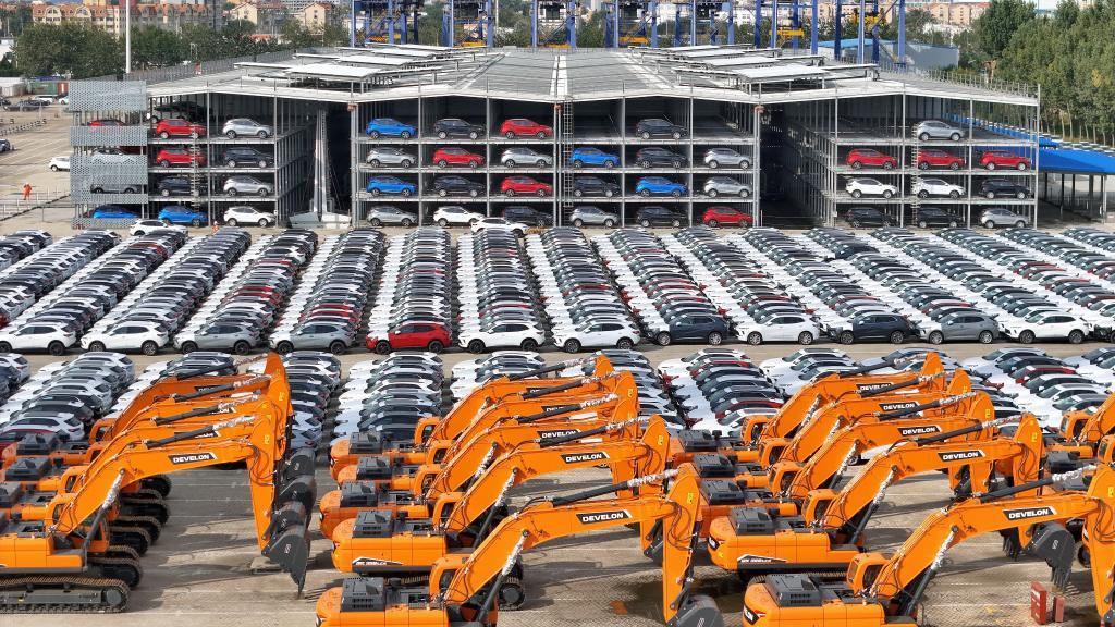 △山東港口煙臺港,國產(chǎn)汽車和工程機械集結(jié)等待裝船出口。