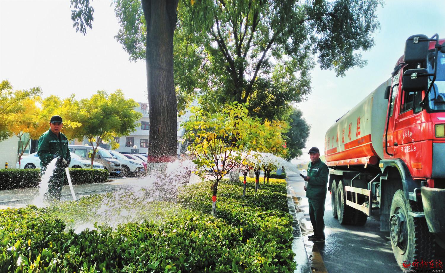 10月15日,園林工人正在忻州城區(qū)長征西街澆灌道路兩旁的綠植,精心養(yǎng)護(hù),讓綠化成果成為城市的亮點(diǎn)。 (宮清華 攝)