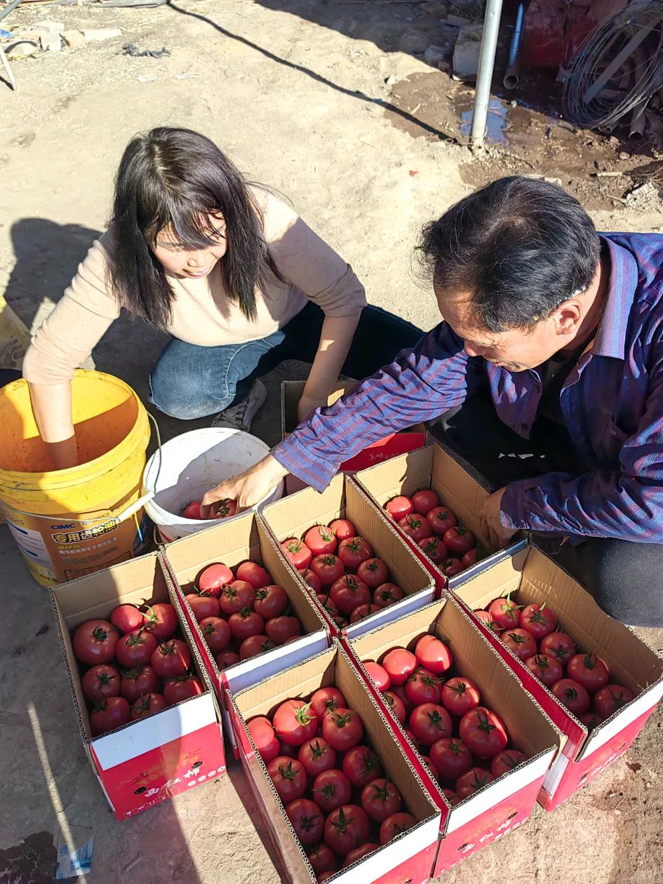 ▲剛采摘的西紅柿裝箱售賣