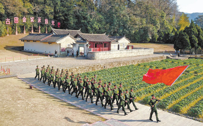 武警福建總隊龍巖支隊組織官兵在古田會議會址前重溫初心。