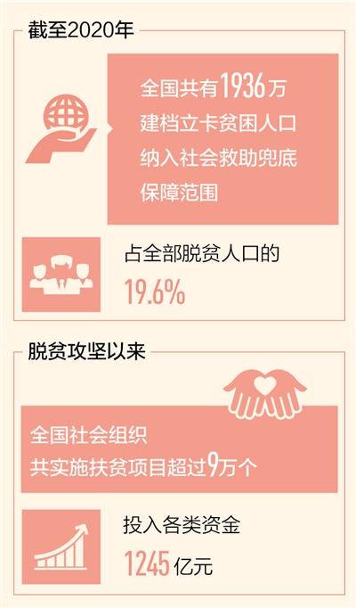 習(xí)近平總書記指出,民政工作關(guān)系民生、連著民心,是社會建設(shè)的兜底性、基礎(chǔ)性工作。決戰(zhàn)決勝脫貧攻堅(jiān),民政部門以完善制度機(jī)制、聚焦特殊群體、助力重點(diǎn)地區(qū)攻堅(jiān)等政策“組合拳”,兜住最困難群體,保住最基本生活。數(shù)據(jù)顯示,截至2020年,全國共有1936萬建檔立卡貧困人口納入社會救助兜底保障范圍,占全部脫貧人口的19.6%,脫貧地區(qū)群眾獲得感、幸福感、安全感不斷提升。
