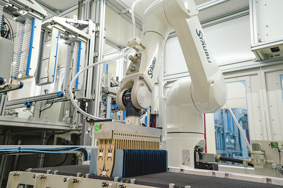 中來電池智能工廠里的機(jī)械臂正在進(jìn)行自動化取放片。圖片由中來提供