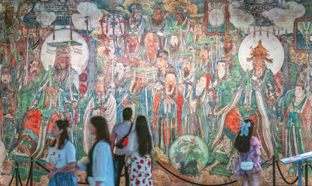永樂宮“壁彩重華”展廳內(nèi),在3D打印、數(shù)字壁畫、AR識別等數(shù)字技術(shù)加持下,700多年前的壁上丹青,完美再現(xiàn)絕世容顏。