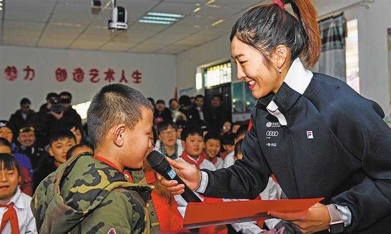 徐夢桃(右)在內(nèi)蒙古阿爾山市白狼鎮(zhèn)白狼小學(xué)為當(dāng)?shù)匦W(xué)生普及滑雪知識(二〇一八年十二月攝)。新華社記者 劉 磊攝