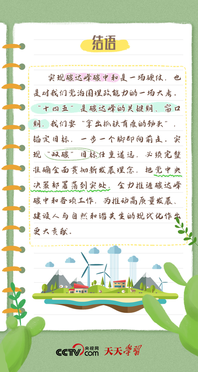 天天學(xué)習(xí)今年全國(guó)兩會(huì),習(xí)近平總書記在政協(xié)聯(lián)組會(huì)上,對(duì)“雙碳”工作作出最新部署??倳洀?qiáng)調(diào):“全面準(zhǔn)確落實(shí)精準(zhǔn)治污、科學(xué)治污、依法治污方針,推動(dòng)經(jīng)濟(jì)社會(huì)發(fā)展綠色化、低碳化,加強(qiáng)資源節(jié)約集約循環(huán)利用,拓展生態(tài)產(chǎn)品價(jià)值實(shí)現(xiàn)路徑,積極穩(wěn)妥推進(jìn)碳達(dá)峰碳中和,為高質(zhì)量發(fā)展注入新動(dòng)能、塑造新優(yōu)勢(shì)。”