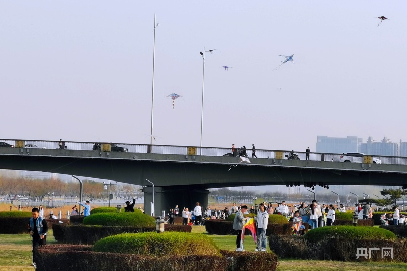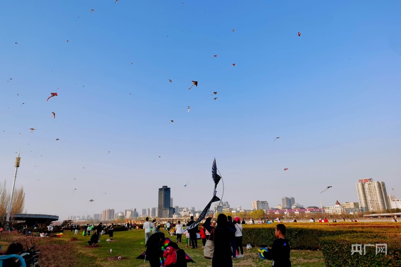 市民聚集在綠意盎然的汾河岸畔放風箏(央廣網記者 郎麒 攝)