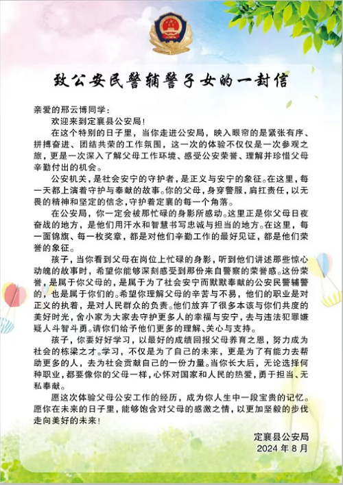 為進(jìn)一步增強中小學(xué)生反詐、禁毒、交通安全意識,通過小手拉大手等形式,大力學(xué)習(xí)、宣傳、弘揚武霖同志英勇無畏、忠誠為民的高尚品質(zhì)。8月20日上午,定襄縣公安局精心策劃,組織開展了“警娃探警營”主題警營體驗日活動,50余名民輔警子女和警爸警媽共同走進(jìn)警營,體驗警察生活、感受警營文化。