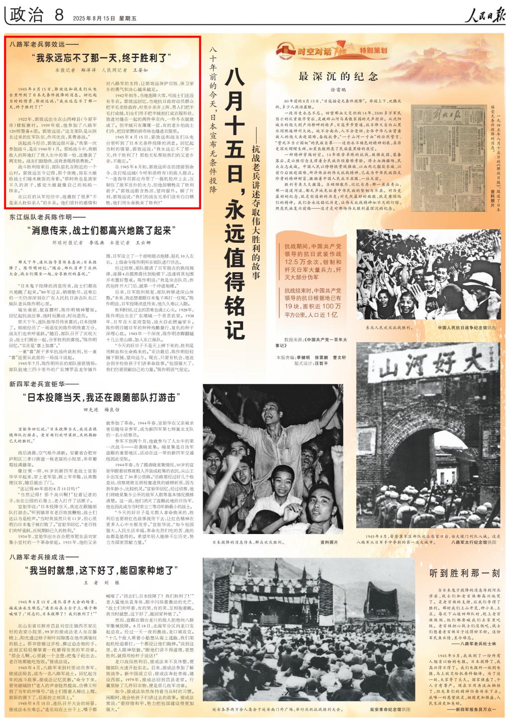 1945年8月15日,郭效遠(yuǎn)和戰(zhàn)友們從電臺(tái)里聽到了日本無條件投降的消息?;貞浧甬?dāng)時(shí)的情景,郭效遠(yuǎn)說:“我永遠(yuǎn)忘不了那一天,終于勝利了!”